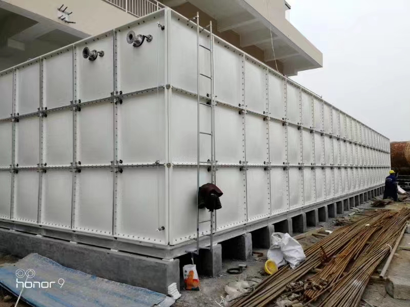 玻璃鋼水箱(xiāng)組件是使用模壓小塊,在(zài)施工現場組裝成一個大(dà)型水箱。要用角鋼固定在外麵,角鋼模型由水(shuǐ)箱構成(chéng),頂部(bù)放置玻璃鋼(gāng)板,然後在(zài)現場添(tiān)加幾層方格布或毛氈以消除裂縫。